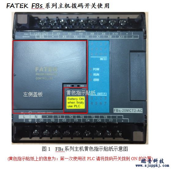 關于永宏PLC系列之FATEK FBs/B1/B1z PLC主機,如若在自帶通訊口PORT0的蓋板上貼有黃色指示貼紙的,便表示此主機存在記憶體電池撥開關。在使用之前,請務必將此撥碼開關撥到ON的位置,否則會導致程序、數據丟失等影響,耽誤您的設備運行。為了防止在運輸過程中,黃色指示貼紙掉落,請您在使用之前,檢查一下您手頭上的主機是否有撥碼開關,并且是否需要撥到ON的位置。